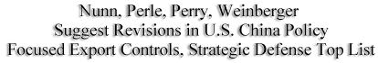 In a joint statement issued by the Committee for the Common Defense, a research program of the Alexis de Tocqueville Institution, former defense secretaries Casper Weinberger and William Perry, former Senate and Pentagon aide Richard Perle, and former Senator Sam Nunn suggested several policy actions in light of a recentcongressional report on Chinese activities in the U.S., and on Chinese actions around the world. Among them --
